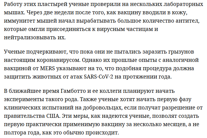 Американскими медиками проведены первые доклинические испытания вакцины от нового коронавируса. Вакцина апробирована на лабораторных мышах и способна воспроизводить антитела к SARS-CoV-2. Результаты опытов опубликованы в научном журнале EBioMedicine.