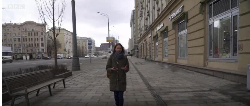 Она рассказывает, что никогда не видела Москву такой тихой. Город заблокирован. Но, все таки, некоторым людям разрешено ходить на работу, но на улицах очень мало людей. В то же время, правительство, не с кем не советуясь, самовольно разместило на улицах высокотехнологичные системы наблюдения.