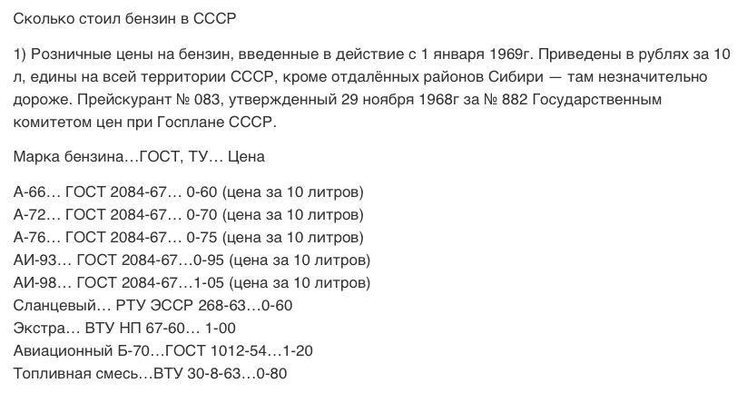 Вы откуда этот фейк взяли? Я за рулем с 1968 г. (водительское удостоверение). Это я Вам могу рассказать, что почем было. Бензин АИ-93 стоил 40 коп/литр. Так что, поторопились Вы со своим лимоном.