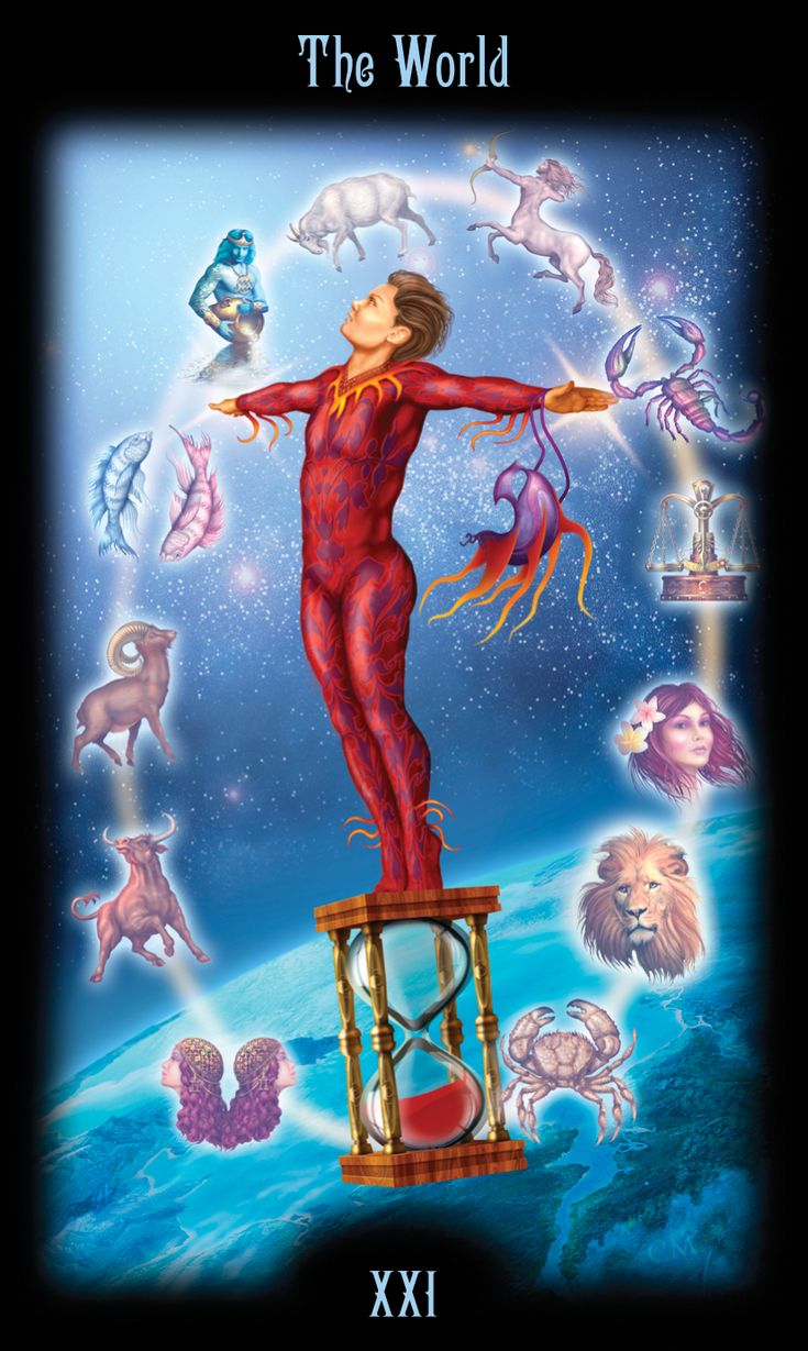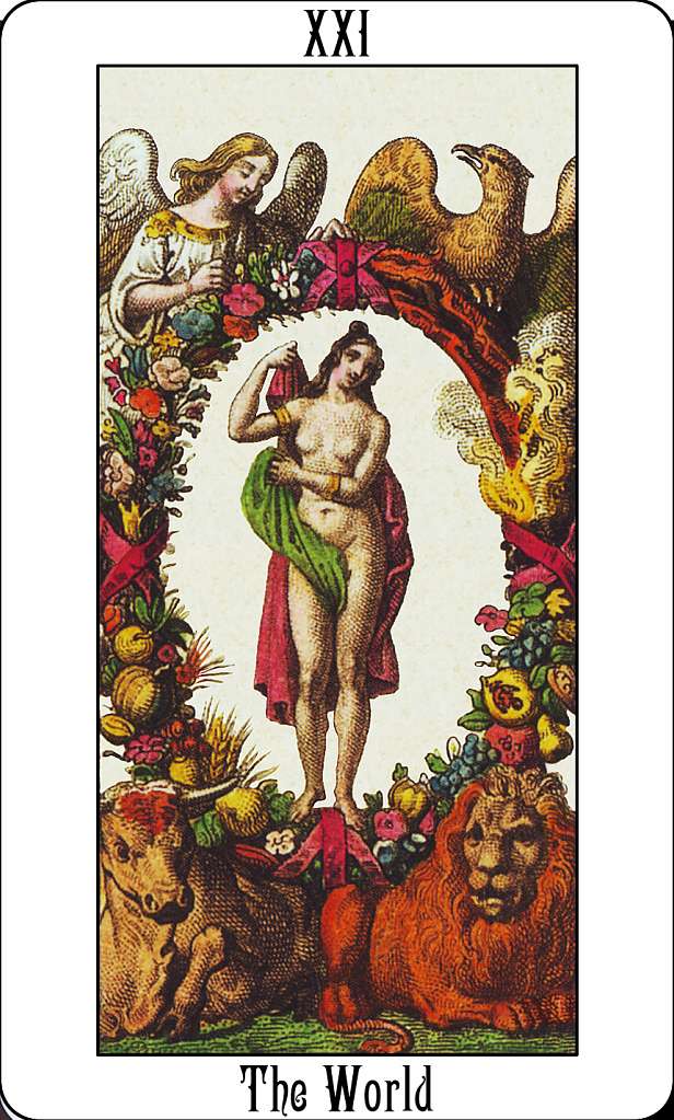 В Таро XXI Аркан так и называется "Мир", в некоторых систеиах - Универсум. Женщина (каеой-то персонаж) танцует на земном шаре, за ней наблюдает четверка евангелических животных.