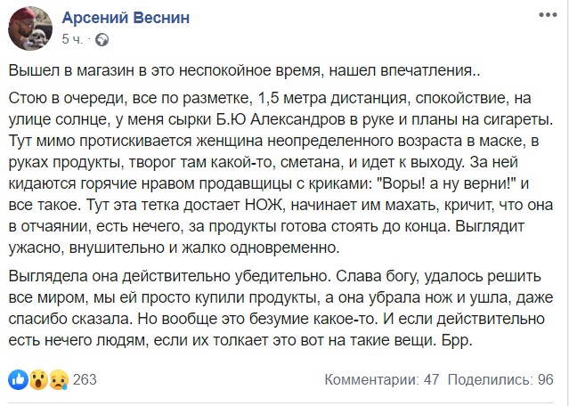 «Выглядела она действительно убедительно. Слава богу, удалось решить все миром, мы ей просто купили продукты, а она убрала нож и ушла, даже спасибо сказала», - написал Арсений Веснин.