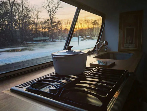 Рядом с рабочим местом расположена кухонная зона. Здесь они сделали все под свои потребности, отказавшись от микроволновой печи, поскольку считают ее ненужной роскошью. Предусмотрели молодые дизайнеры и способ расширения площади для приготовления еды за счет крышки на кухонной раковине. Она выполнена из того же материала, что и столешница – деревянная. Очень многие вещи в автодоме имеют многофункциональное применение.