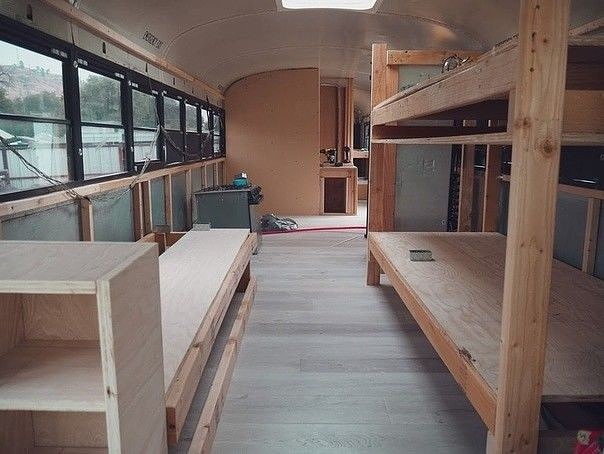 Демонтировав сиденья, подготовив свободное пространство, они начали делать из дерева зону отдыха. Внутреннее пространство автобуса разбили на несколько зон – таким образом получилась малогабаритная квартира, где есть все: кухня, биотуалет, душ, место отдыха.