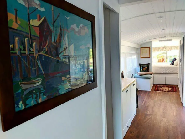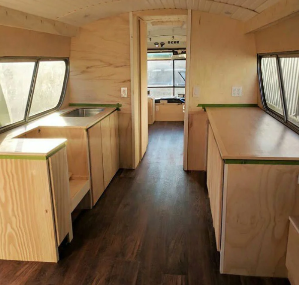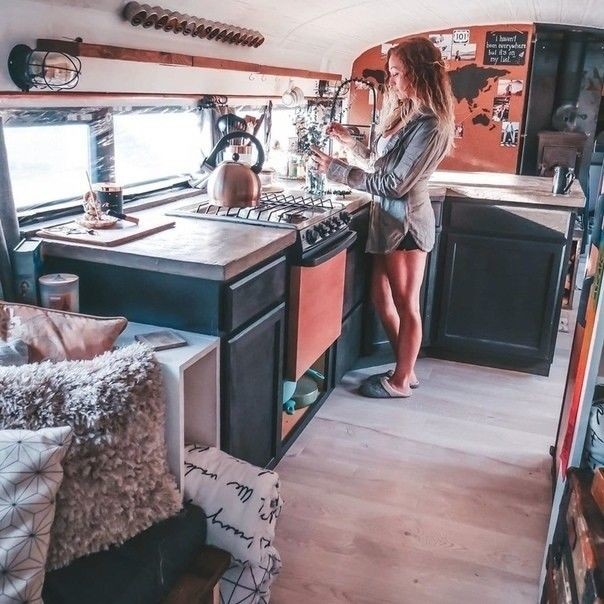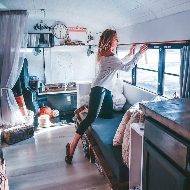Как и у других наших героев этого рассказа, хозяйка автобуса выполнила внутреннюю отделку из дерева, которая явилась каркасом для дизайна интерьера. Таким образом, старый автобус, которому суждено было стать металлоломом, превратился в современную квартиру, где все предусмотрено до мелочей от кухни до зала. При виде этого автобуса складывается впечатление, что ты находишься в шикарной квартире.