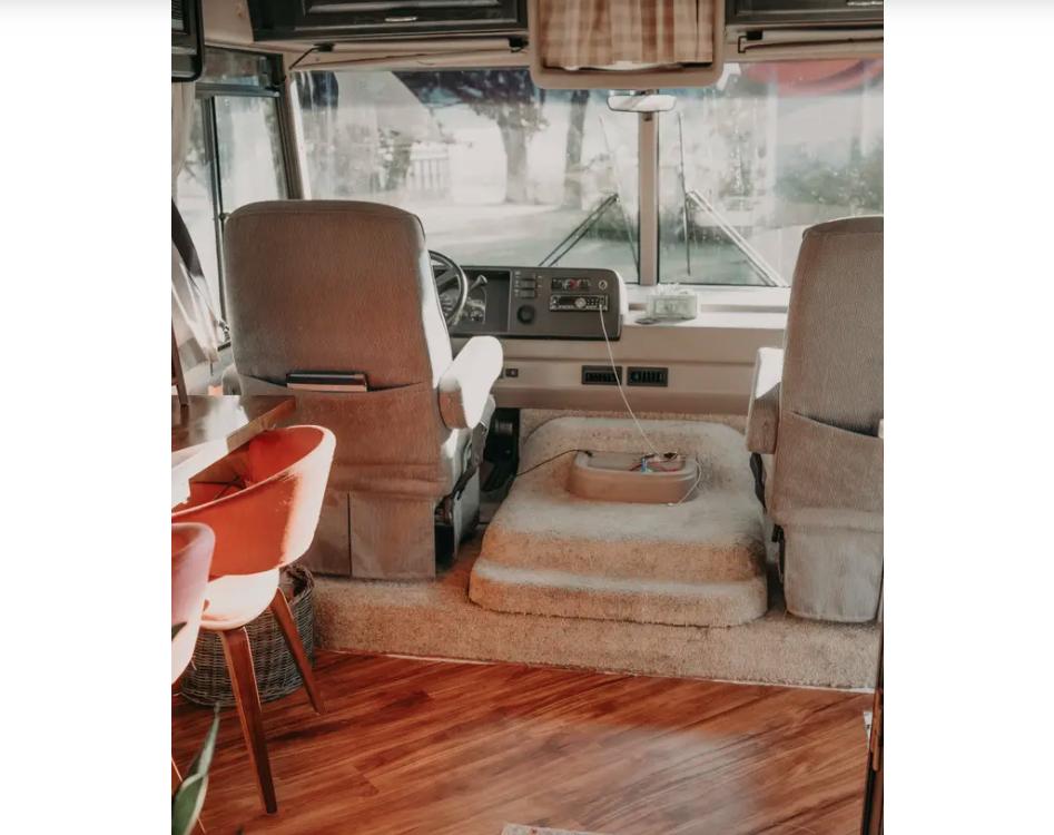 За счет деревянной отделки стен, у жилья на колесах красивый, современный дизайн интерьера. В автодоме молодая пара предусмотрела все для удобства. Если надо создать пространство для гостиной, то достаточно развернуть сиденья фургона, когда они не за рулем.