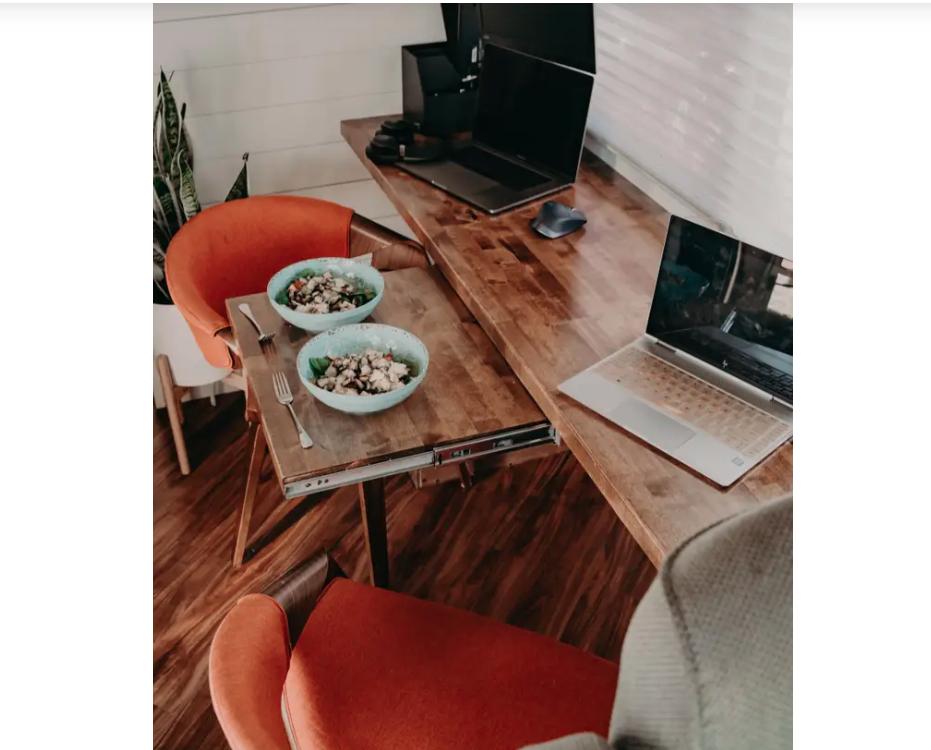 Самая любимая часть для семьи – их рабочий уголок. Обеденная зона представляет из себя длинную столешницу. В дни, когда ребята не заняты фотосъемкой, они работают дистанционно в автодоме. Каждому из них хватает своего личного пространства: его заменяют края длинного стола, который снабжен раздвижным механизмом.