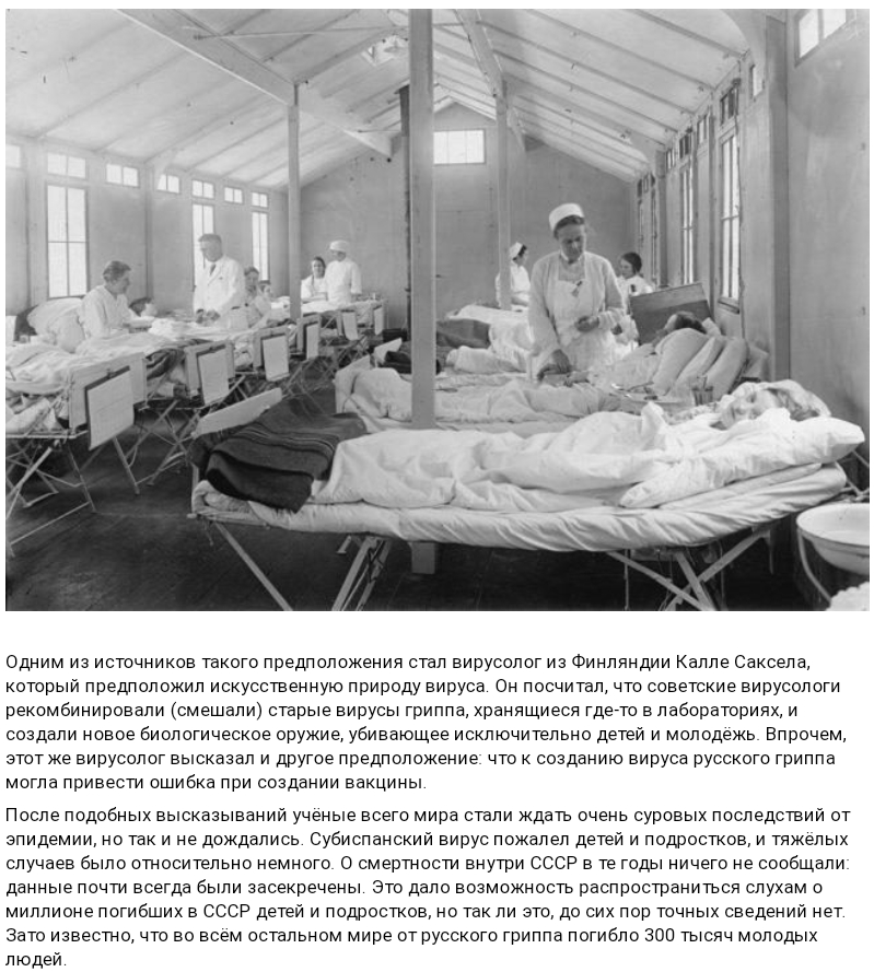 Оказывается в Советском Союзе в одно время вирус гриппа ''косил''молодёжь до 25 лет. От него погибали молодые люди во всех регионах страны, данные до сих пор засекречены, но конспирологи насчитали миллион погибших.😱😨