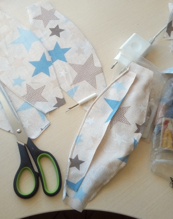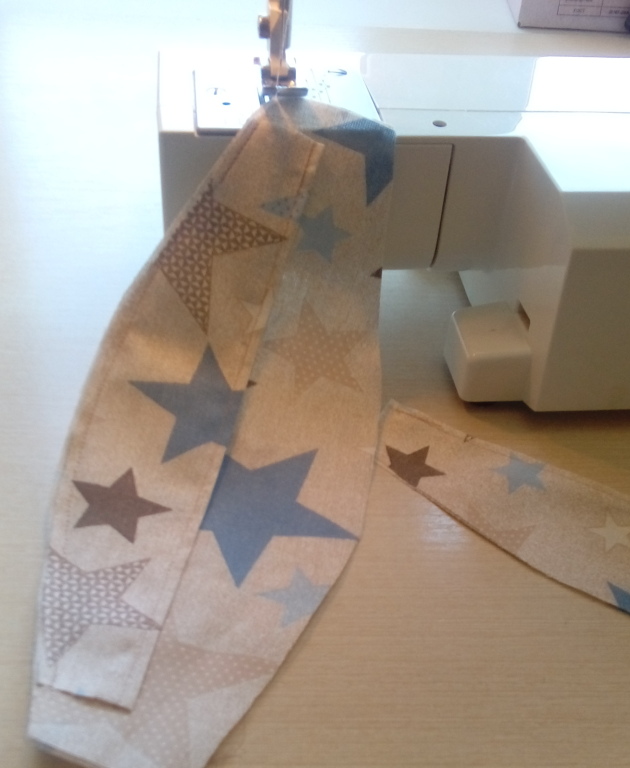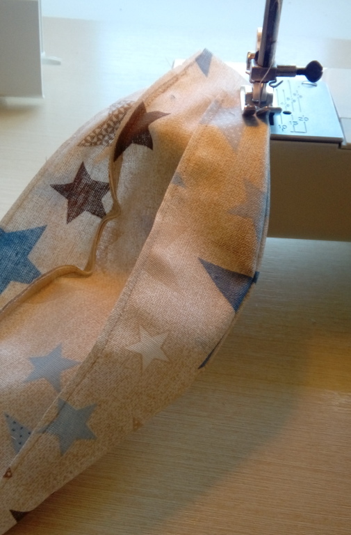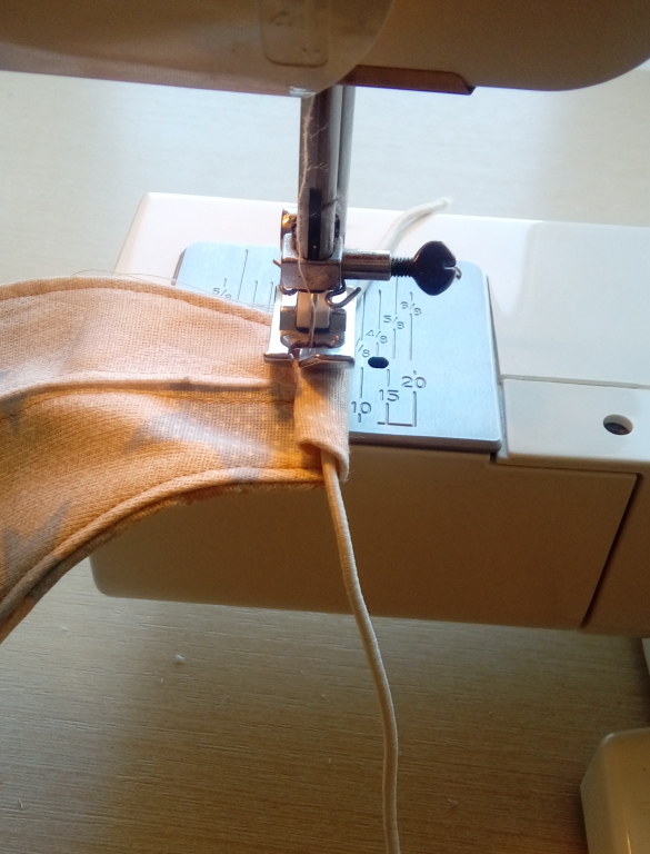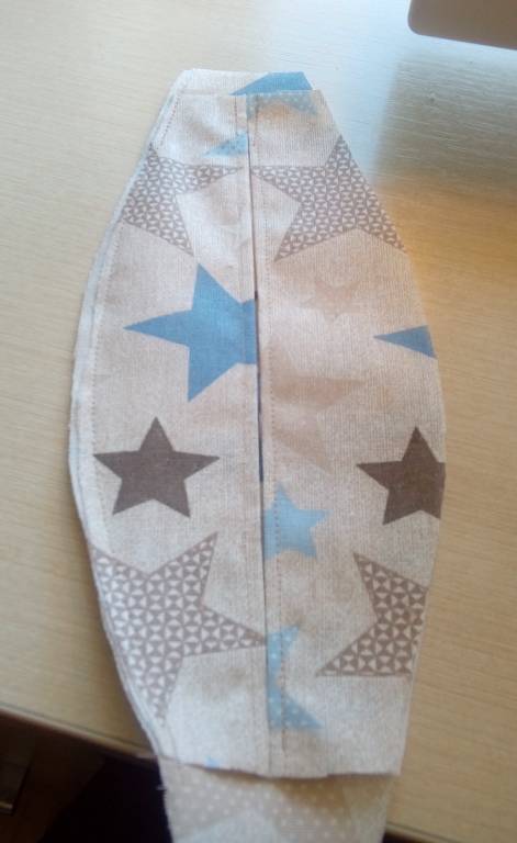 И начинаем пришивать. Здесь: левая уже пришита, а правую еще предстоит. После, нужно вывернуть маску и прошить по краю еще раз, чтобы маска была более культурная и аккуратная. Все швы останутся внутри, поэтому оверлок не нужен.
