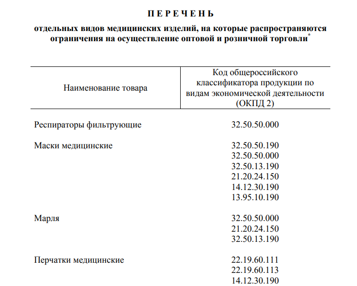 К таким медицинским изделиям отнесены фильтрующие респираторы, медицинские маски, марля, медицинские перчатки, комплекты защитной одежды для медицинских работников.