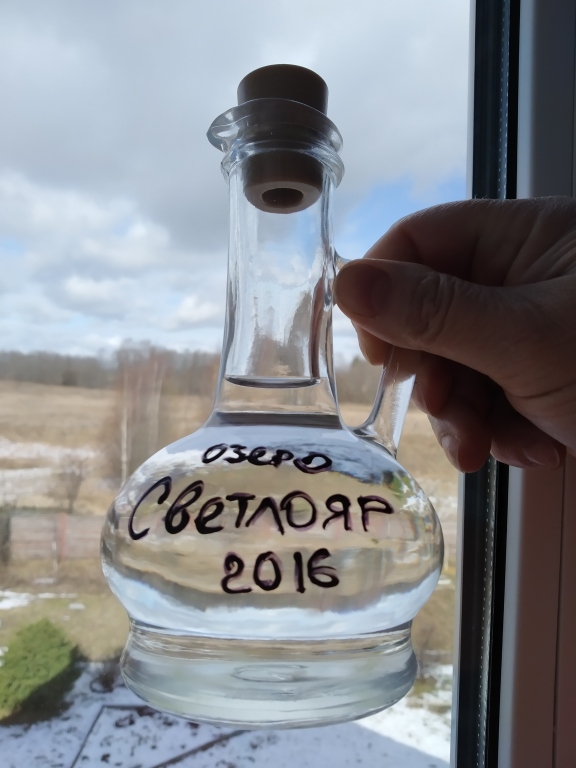 Так же говорят, что горсть земли из этого места вылечивает многие заболевания, а вода из озера стоит несколько лет и не цветет и не портится - как святая вода. И в подтверждение этого факта - вот вам фотография сосуда с водой из озера Светлояр, которую я набрала в 2016 году. Вода не помутнела, не испортилась, она прозрачна и свежа, как только что набрана из родника. Удивительно, но факт...