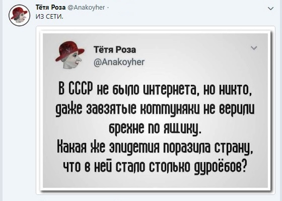 27 лет врут и про СССР, и про то что Все являются гражданами коммерческой"виртуалки"РФ! Все карпорации и частные лица, государство СССР не каппитулировало, нет передачи территорий, зато всех сделали мигрантами! Так это надо быть полностью безумным чтобы верить продажным СМИ! Их хозяева опоачивают эту ложь! День Победы аккупировали, называют своей, под флагом Власова! Монеты чеканят даря ветеранам, таким образом издеваются что ли? Монеты с одной стороны звезда с другой двуглавый орел, причем в рекламме, "орловая" часть поворачивается быстрее, чтоб не обращали внимание! Так до каких пор может ЧЕЛОВЕК быть лояльным тотальной Лжи? Посмотрел ролик где девушка прямо говорит, что раньше думала что "быдло" это пропоицы,. бродяги, бомжи без образования! А теперь говорит убедилась что "быдло" это это "средний"класс образованный но ему плевать на то что происходит! Он не читает законов, не проверяет информацию, ему по зомбоящику "лепят" такую чушь, и он согласен! Это ужас полный! Действительно ужас, всех тотально "загоняют" в "цифру", на минутку, это Фашизм! Это система давно не учитывает мнение своего Народа! Губернаторы прямо называют народ РАБАМИ! Причем выделяя, предприниматели и РАБЫ! Затем извиняясь, что это оговорка! Скажу просто если я использую не цензуру, то когда забываюсь, "крепкое словечко",иногда вылетает! Так о чем это говорит, только о том что часто употреблялось ранее! Делайте выводы, какое отношение к Народу! Изучайте, не болейте, Света Всем и Добра! Понимания! Народ Германии, в свое время тоже на ура принял Гитлера и его политику, не делайте ошибок! Управляют нами "калабрационисты" ,по простому они в одной "упряжке" Мировым Капиталом, стремящимся к Глобальному порабощению, через Цифру! Вакцинация ими затеянная, это и будет последний рубеж для Душ! ВВП поддержал же нашего академика, в идее "Служебного" Человека! И вот и размышляйте, каким образом! А нужна ли им Ваша Душа,?:: а может просто "робот"?Мира всем!