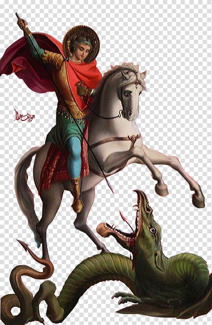 -Прилетел дракон и поселился на вон той горе! Потребовал, чтобы ему отдавали на съедение парней и девушек! Горожане взмолились и приехал Святой Георгий!