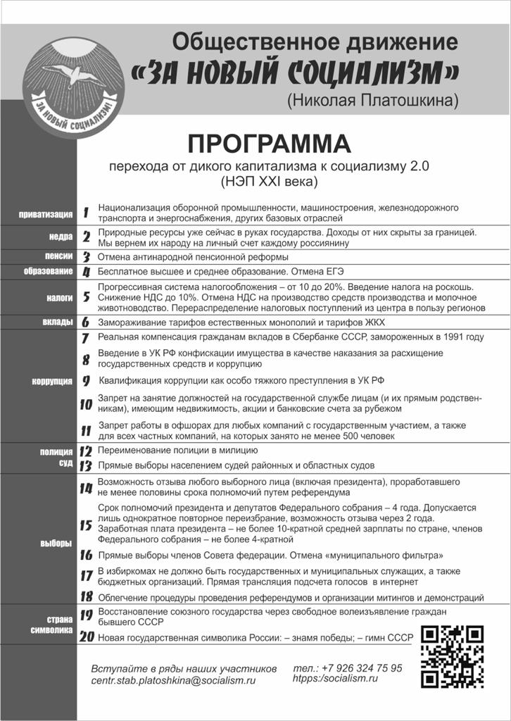 4. Реализовать масштабную государственную программу занятости, которая позволит стране выйти из экономического кризиса. Организовать общественные работы (благоустройство, озеленение, строительство, сфера услуг, сельское хозяйство и т.д.) для граждан, лишившихся источников дохода, с оплатой не ниже двух МРОТ.
