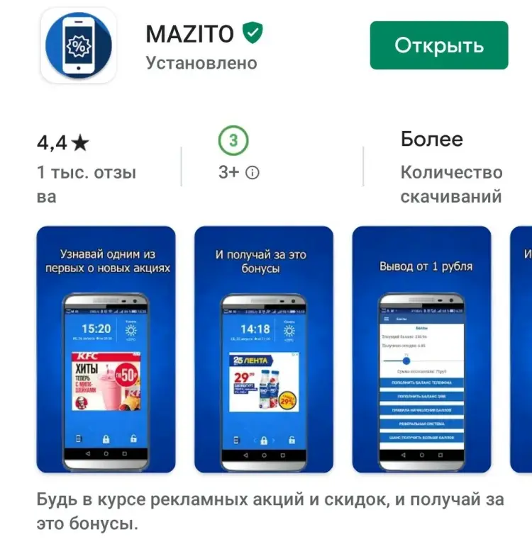 Суть работы приложения такова, что при использовании приложения с включенной блокировкой экрана от MAZITO, с обновленной версией приложения, начисляются баллы. Также существуют реферальные баллы.