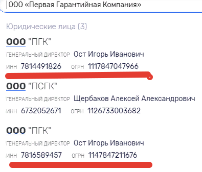 По наименованию в ИФНС России стали разыскивать фирмы, и обнаружилось, что под одним и тем же наименованием зарегистрировано две организации ООО «Первая Гарантийная Компания», где в качестве генерального директора одно и то же физическое лицо Ост Игорь Иванович (фото 3).