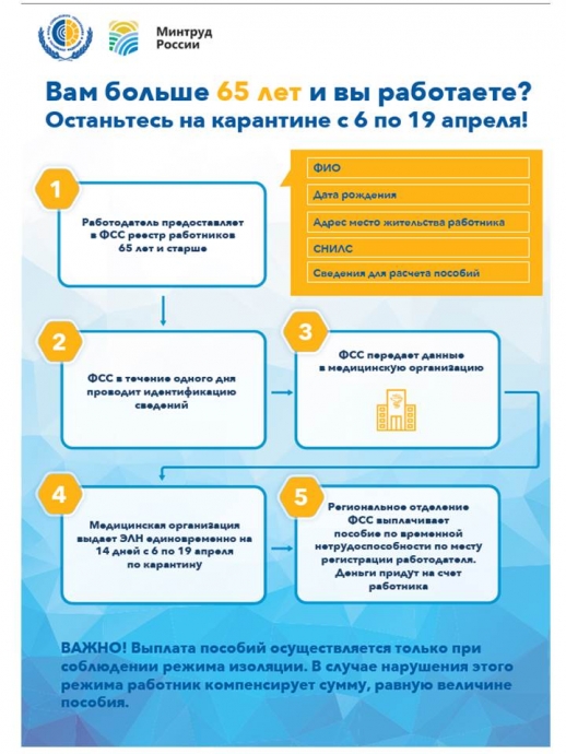 Астраханское региональное отделение Фонда социального страхования РФ информирует, что в соответствии с постановлением Правительства РФ от 01.04.2020 г № 402 «Об утверждении Временных правил оформления листков нетрудоспособности, назначения и выплаты пособий по временной нетрудоспособности в случае карантина застрахованным лицам в возрасте 65 лет и старше» работодателям (страхователю) следует проинформировать своих работников, достигших по состоянию на 6 апреля возраста 65 лет и старше о необходимости: