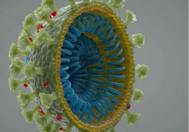 Коронавирус в представлении художника. Синяя спираль символизирует спираль РНК, находящуюся внутри липидной оболочки вируса.