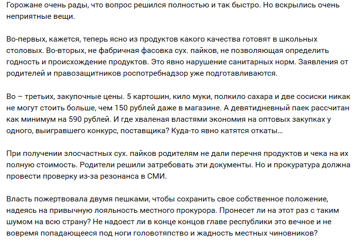 Несколько позднее главой администрации Питкяранты Дмитрием Трошиным было сделано заявление о том, что директор местного комбината школьного питания, которая собрала такой набор для школьников уволена. Попутно он сообщил что также крайне возмущен возникшей ситуацией с сухими пайками и дал обещание, что сухие пайки в полной комплектации получат все нуждающиеся из данных категорий льготников.