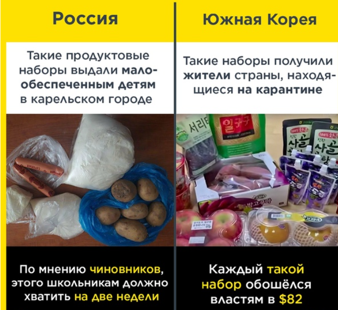 В Карелии в городке Питкяранта школьникам из малоимущих семей и детям-инвалидам выдали бесплатные продуктовые наборы на две недели. В набор собрали следующие продукты: 5-6 картофелин, 2 сосиски, кусок маргарина, 1 кг муки и 0,5 кг сахара. Родители детей вместо благодарности, по мнению властей, почему-то стали возмущаться данным комплектом продуктов помощи.