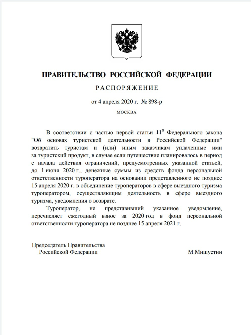 "Об основах туристской деятельности в Российской Федерации" Правительством РФ принято решение о возврате туристам и (или) иным заказчикам уплаченных ими за туристский продукт денежных средств, в случае если путешествие планировалось в период с начала действия ограничений, предусмотренных указанной статьей, до 1 июня 2020 г.