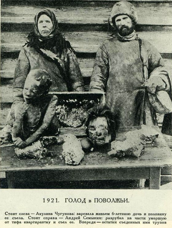 В голодные 1921-23 г.г. начала прошлого столетия Поволжье России потеряв более четверти своего населения выжило откровенно промышляя каннибализмом На прилагаемом фото японского корреспондента мать зарезав шестилетнюю дочь половину съела а вторую половину вынесла на продажу. Менее года осталось до столетнего юбилея голодных кошмаров начала прошлого столетия. Как праздновать будем господа товарищи?