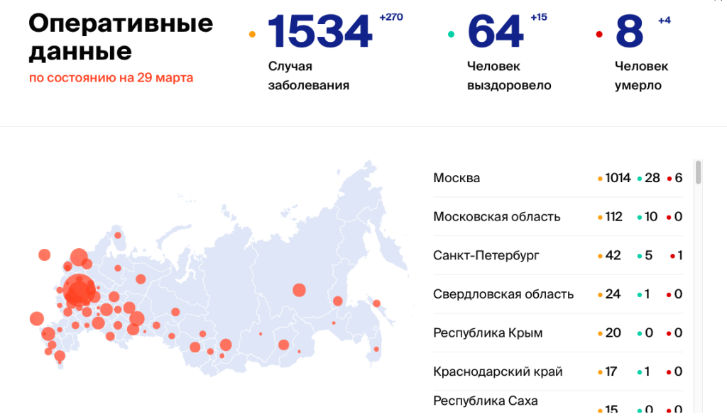 А так выглядели данные с сайта СТОПКОРОНАВИРУС на 29 марта 2020 года.