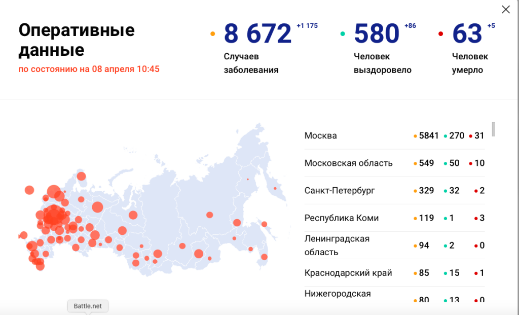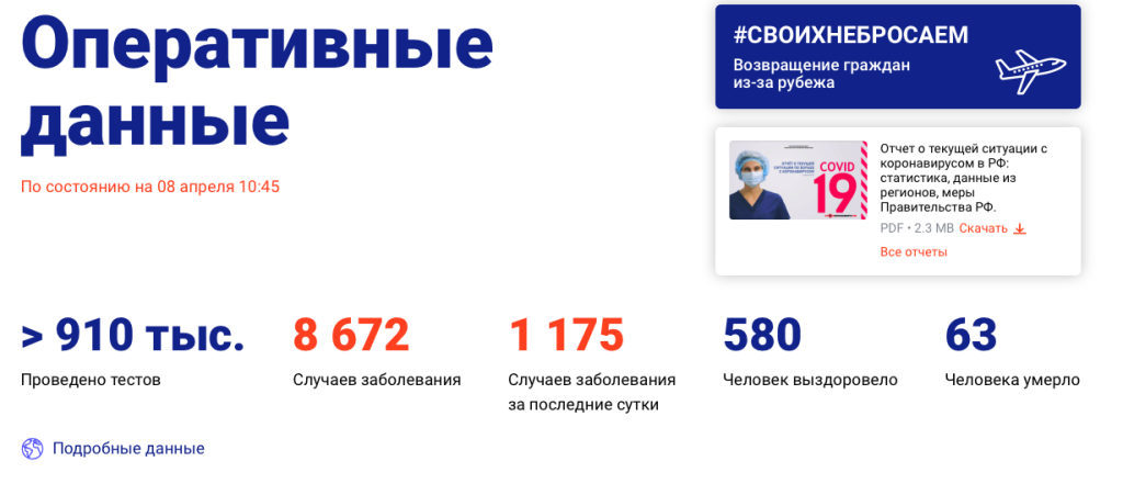 Приведу вам данные по эпидемиологической обстановке по России на сегодняшний день 8 апреля 2020 года: