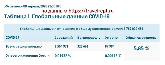 Чемпионат мира по противодействию пандемии Covid-19 продолжается. Сегодня очередная круглая цифра - количество подтверждённых случаев заражения коронавирусом SARS-CoV-2 перешагнула отметку в 1 500 000 (полтора миллиона) человек. Человеческой популяции пока это особо не угрожает - это составляет 0,01932 % от всего населения Земли.