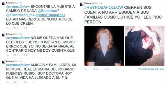 16 октября 2014 года с Twitter-аккаунта Фелины было опубликовано сообщение «Друзья и семья. Моё настоящее имя — Мария Дель Розарио Фуэнтес Рубио. Я врач. Сегодня моя жизнь подошла к концу». Несколько следующих твитов были отправлены подписчикам девушки. В них содержалось предостережение о том, что «картели ближе, чем вы думаете».