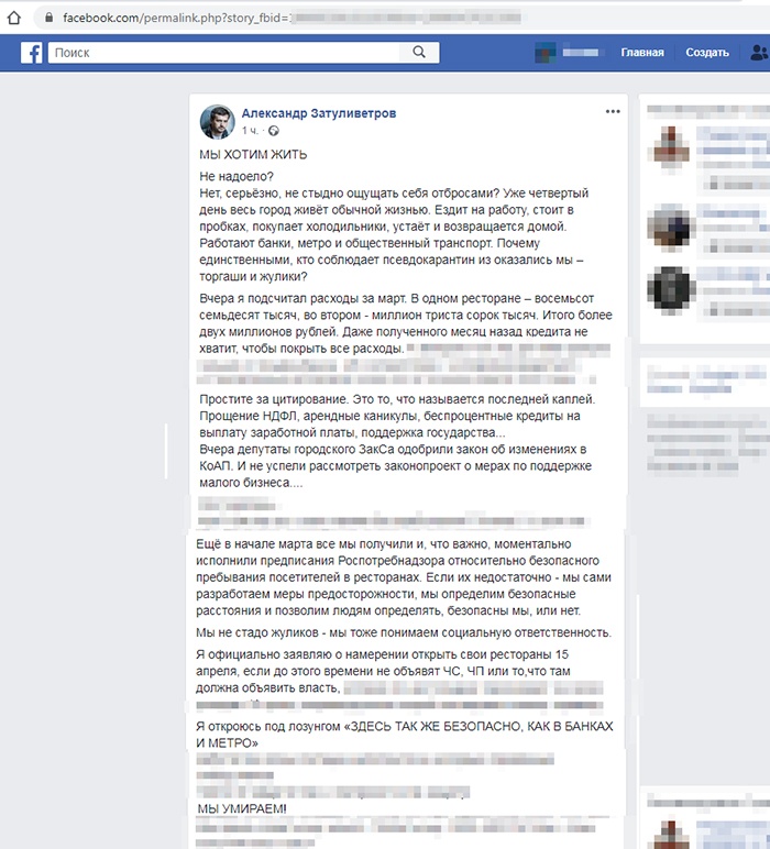 В посте под заголовком «Мы хотим жить» ресторатор указывает, что жители Петербурга не слишком ревностно соблюдают режим самоизоляции. «Уже четвертый день весь город живёт обычной жизнью. Ездит на работу, стоит в пробках, покупает холодильники, устаёт и возвращается домой. Работают банки, метро и общественный транспорт», — отмечает он.