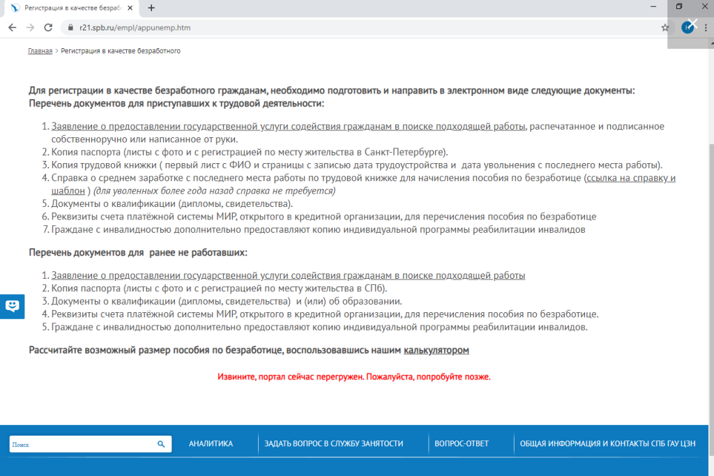 Фото: скриншот страницы сервиса. О проблемах — в частности, о необходимости сжимать документы до 6 Мб — сообщали и ранее. Читатели неоднократно, том числе и 9 апреля, жаловались, что не могут пробиться сквозь стену молчания сайтов Центра занятости и госуслуг. Возможно, скоро это будет и не актуально: по данным «Фонтанки», в ближайшее время должен быть опубликован новый порядок дистанционной постановки на учет. Это может произойти уже до конца недели. Какое место в нем будет (если будет) уделено личному кабинету на сайте центра занятости — не известно.
