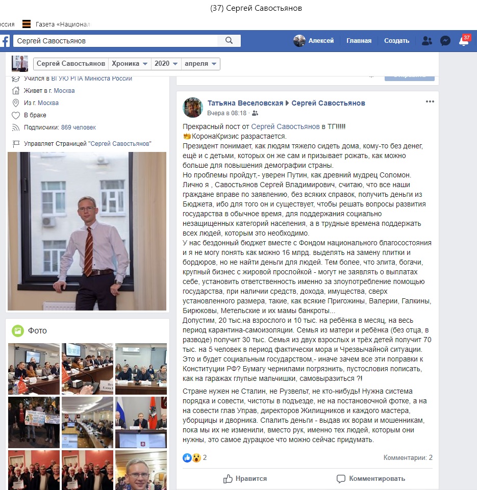 9 апреля 2020 Сергей Савостьянов написал в фейсбуке