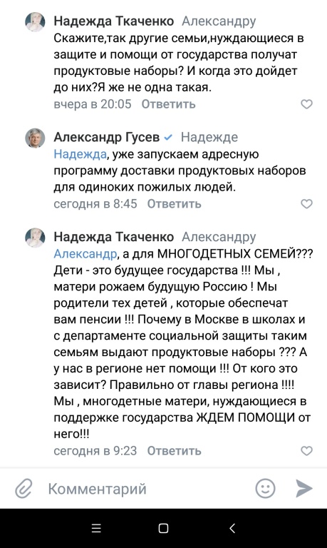 Целую неделю билась над разрешением по ситуации помощи семьям с детьми, нуждающимися в поддержке государства, в этот сложный период самоизоляции. Когда многие потеряли заработок, отправлены на БС или сидят на минимальной оплате заработной платы. Путин дал полномочия главам областей решать проблемы региона исходя из ситуации в данном регионе, поэтому мы такие семьи ждали помощи и принятия мер социальной поддержки от нашего губернатора и департамента социальной защиты населения!