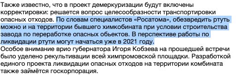 «По словам специалистов Росатома, обезвредить ртуть можно и на территории бывшего химкомбината при условии строительства завода по переработке опасных объектов», - было сказано на сайте администрации муниципалитета.