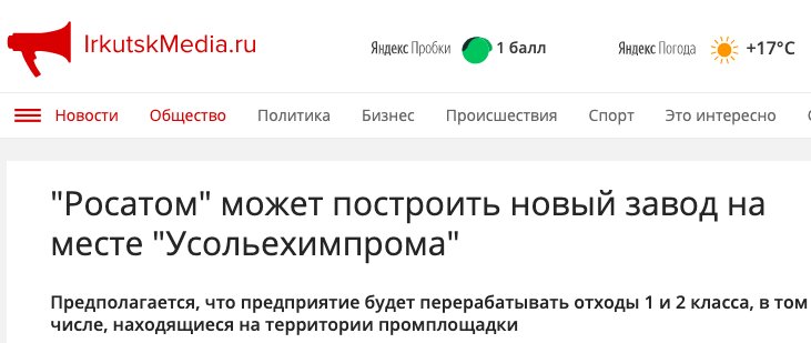 В иркутских СМИ прошло сообщение, что работами по ликвидации химического загрязнения дело не ограничится и Росатом построит на месте «Усольехимпрома» новый завод - по переработке химических отходов 1 и 2 класса.