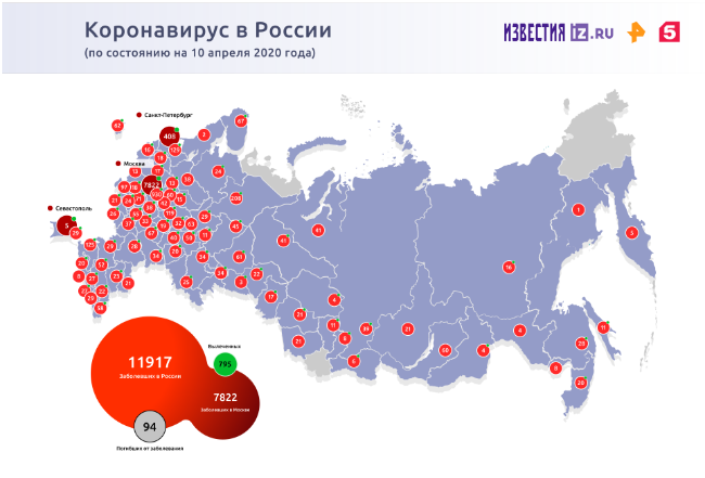 Вспышка заболевания COVID-19, вызываемого вирусом SARS-CoV-2, произошла в китайском Ухане в конце декабря прошлого года. По данным на 10 апреля, в России число зараженных коронавирусом превысило 11,9 тыс. человек, 94 пациента скончались, 795 выздоровели.
