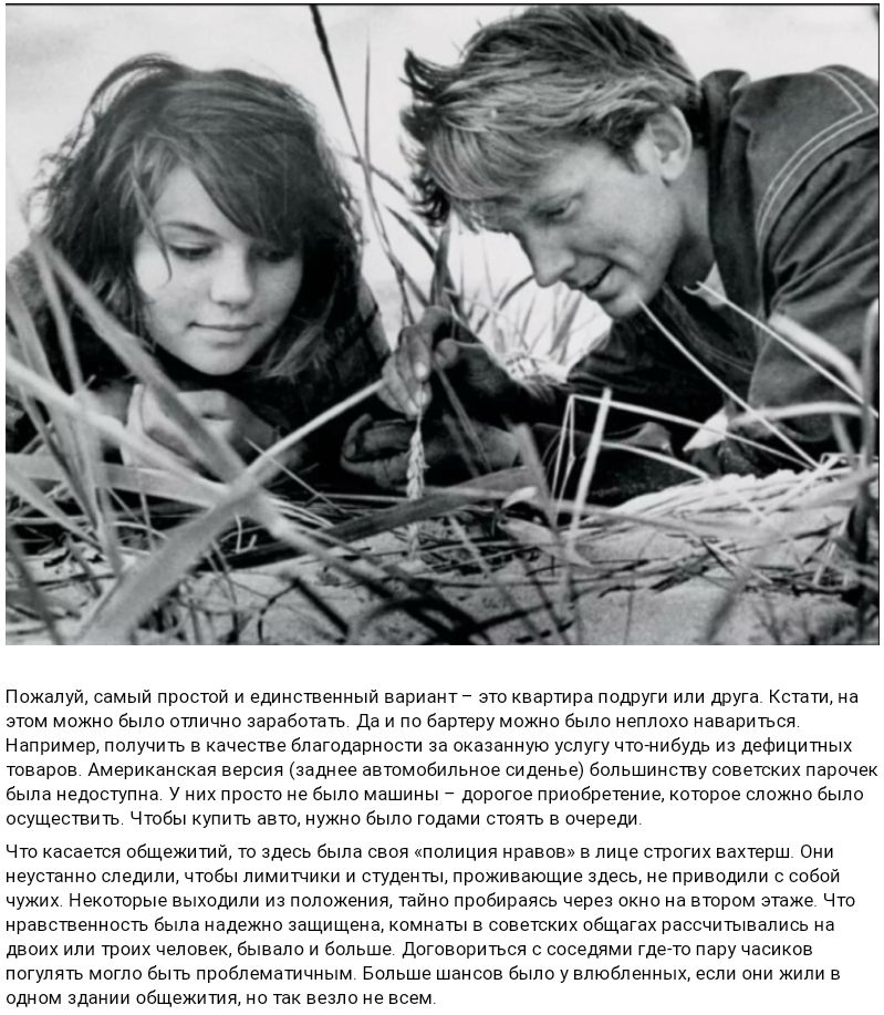 А если кто помнит не было особо места для интимной встречи. В СССР с поисками подходящего для этой цели помещения было катастрофически туго. Здесь тоже сыграл свою роль тотальный дефицит на все, в том числе и на жилплощадь.