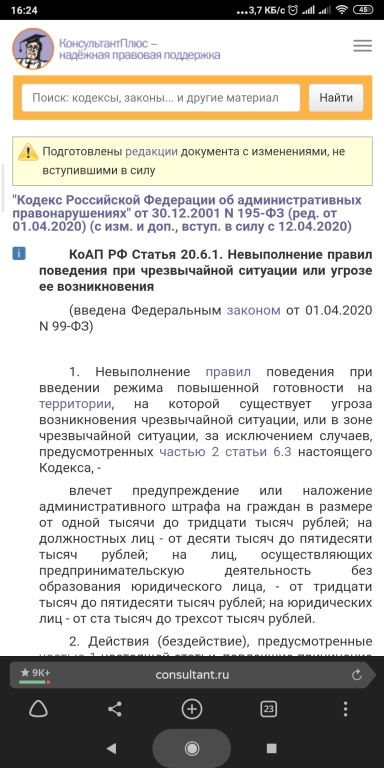 Были внесены изменения в ст. 6.3 КоАП РФ «Нарушение законодательства в области обеспечения санитарно-эпидемиологического благополучия населения». Введены ч.2 и ч.3, причем штрафы за такие нарушения весьма серьезные, от 15 до 40 тысяч рублей для граждан, а по ч.3 от 150 до 300 тысяч рублей. Данные изменения внесены ФЗ №99 от 1 апреля 2020 года. Причем принят закон был в рекордно короткие сроки.