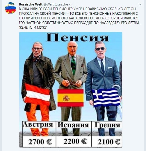 Сын бывает в странах ЕС и много рассказал: о пенсиях и как начисление их производится, возраст выхода на пенсию, о ценах. За США, почему молчим сколько стоит вызов "Скорой помощи", лежать в больнице и всех ли в нее могут положить? Все ли получают пенсию? Тут глубокое молчание будете хранить.