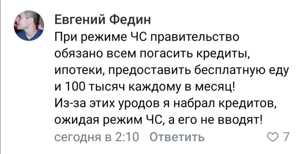Дождёшься от них, они ещё и процентов побольше намотают, чтоб всю жизнь у них в кабале сидеть. В России вместо помощи от государства, только пакости можно ждать. Даже пример с повышением цен на имбирь, лимоны и чеснок. Вместо того, чтобы наоборот снизить на них цены, вот мол, люди, повышайте иммунитет, так нет, лучше сдохните, зарплату не дают, помощь не дают, цены на всё повышают, вот вам и великая страна, где правительству пофиг на народ.