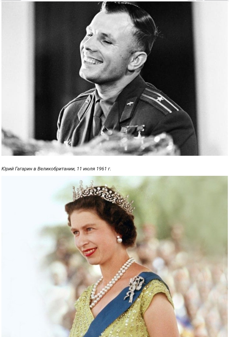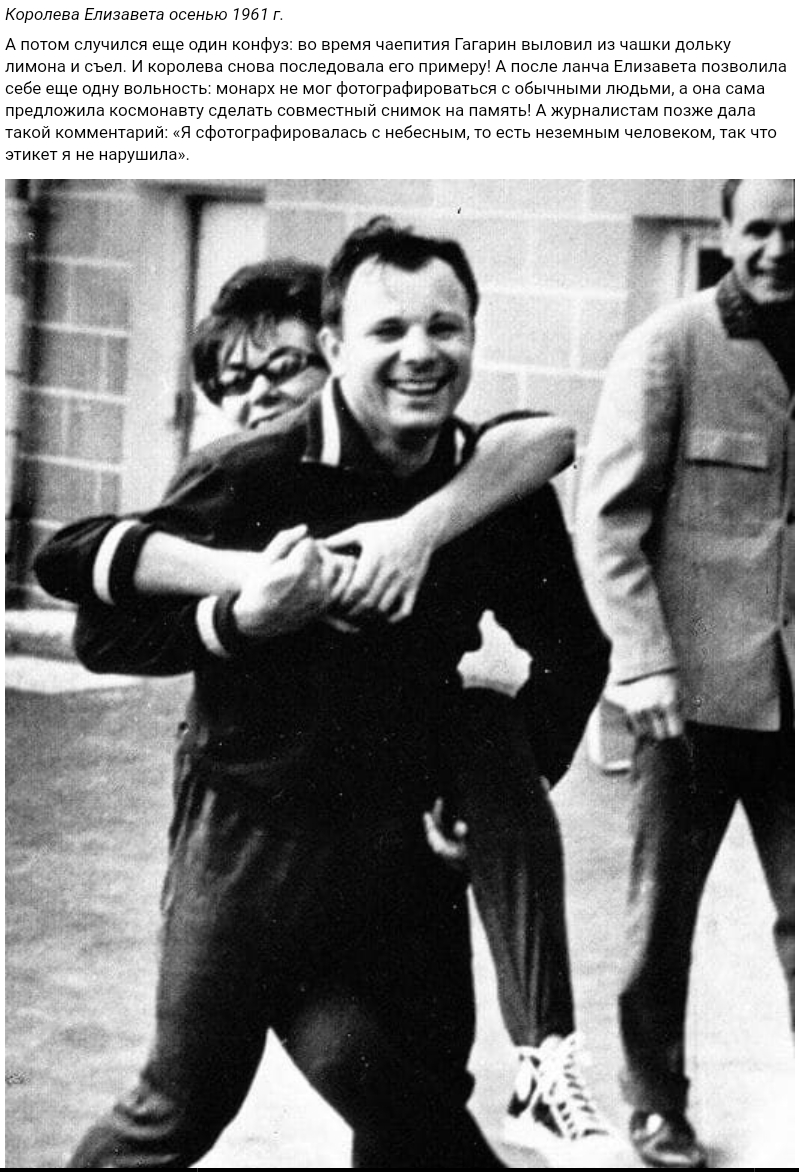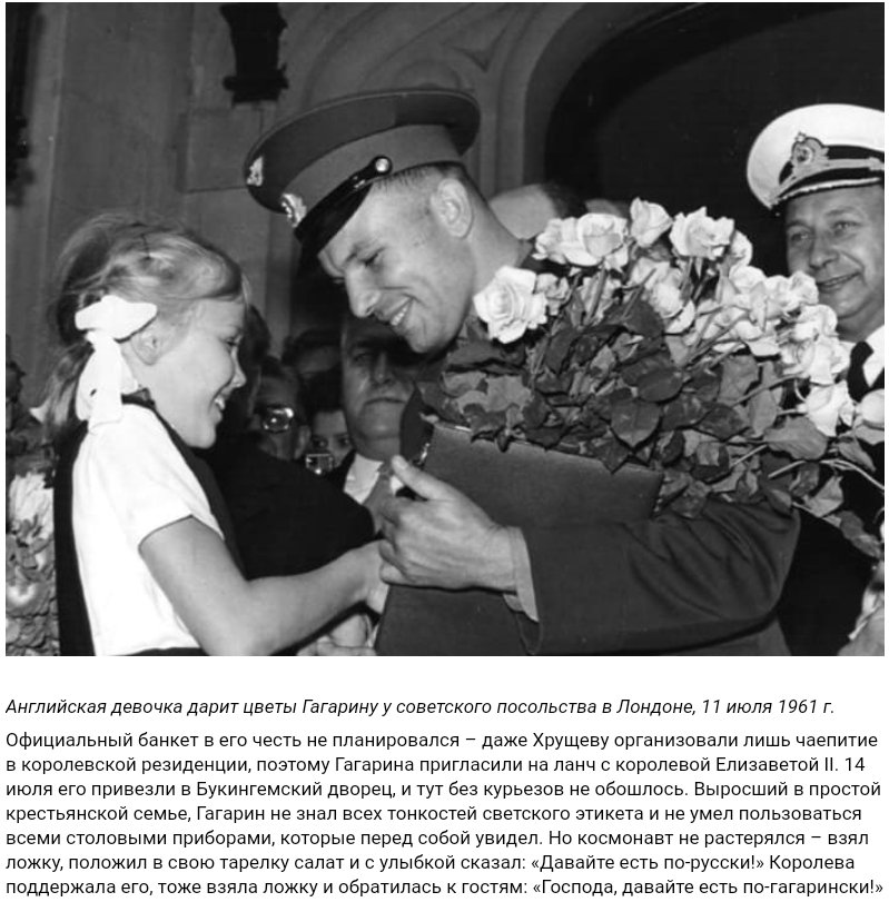 Но он не растерялся:«Я простой советский лётчик, и не разбираюсь в правилах этикета»-честно сказал Гагарин королеве. Елизавета легко разрядила обстановку: «Ешьте как хотите, а я буду за Вами повторять»...