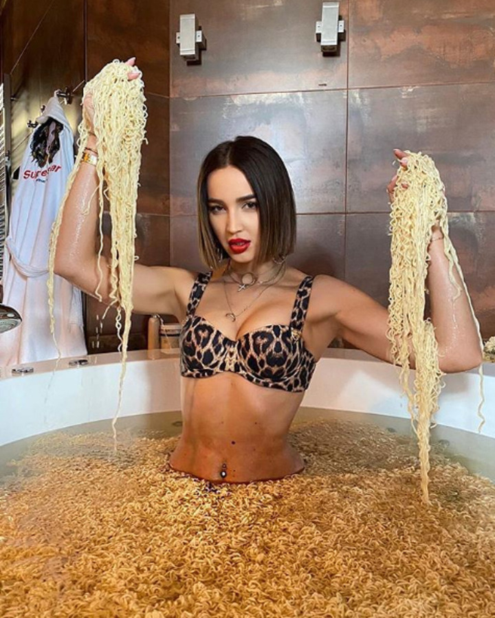 Певица и бывшая звезда проекта «Дом-2» Ольга Бузова выложила в Instagram**** фото, на котором она в леопардовом купальнике принимает ванну, полную лапши. «С понедельника в зал», - сопроводила артистка свой кадр.