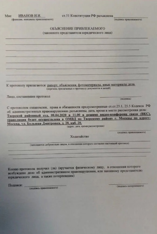 МВД РФ: Образец Протокола об Ответственности за нарушение режима самоизоляции.