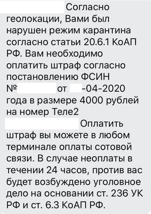 Сообщения могут приходить, как в формате смс, так и на любые мессенджеры или в социальных сетях. Текст чаще всего банален: « (фамилия, имя, отчество), согласно геолокации, Вами был нарушен режим карантина согласно статьи 20.6.1 КоАП РФ. Вам необходимо оплатить штраф согласно постановлению ФСИН № …. от ……. 2020 года в размере ….. рублей на номер……Оплатить штраф Вы можете в любом терминале оплаты сотовой связи. В случае неоплаты в течении 24 часов, против Вас будет возбуждено уголовное дело на основании ст. 236 УК РФ и ст. 6.3 КоАП РФ».