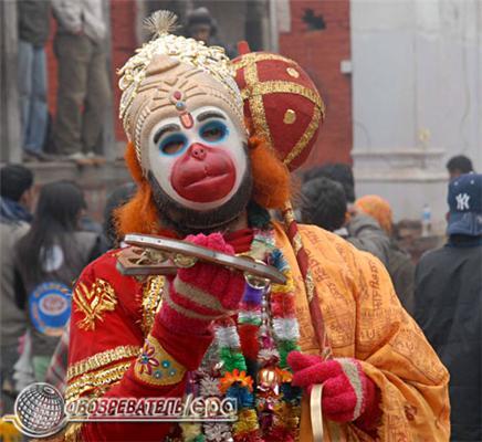 Между тем одни участники шествия украшали статую гигантской обезьяны гирляндами, другие, надев обезьяньи маски, сражались шестами.