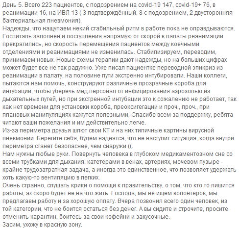Тестирование медперсонала на Covid-19 только собираются ввести, а в контакте с инфицированными пациентами мы побывали все, и как дела обстоят по факту, одному Богу известно. Респиратор, например, обеспечивает только 95% защиты.. И каждый раз уходя с работы, я не знаю, может, я уже потенциальный пациент своей же реанимации, и это вопрос всего лишь нескольких дней.