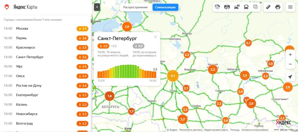 К обеду 14 апреля почти вся Россия опустилась в опасную с точки зрения распространения коронавируса «красную» зону индекса самоизоляции — ниже 2,4 балла. У границы балансируют всего несколько городов, в том числе Санкт-Петербург, он четвёртый в списке городов-миллионников.