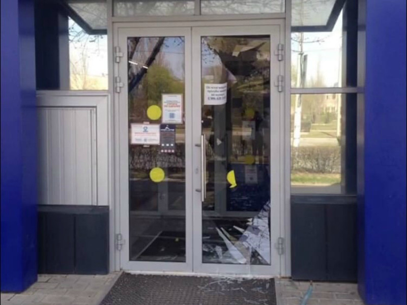 Злоумышленники ночью разгромили вход в магазин «Спортмастер».
