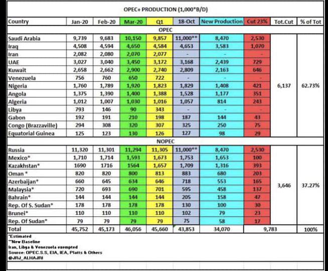 В понедельник стали окончательно понятны итоги сделки ОПЕК+, переговоры по которой длились 4 дня (итоги переговоров сведены в таблицу аналитиком по ОПЕК Аль-Хаджри).Общее сокращение в рамках стран ОПЕК+ было согласовано в размере 23% для каждой из стран-учатниц ОПЕК+ (кроме Венесуэлы и Ирана, которые находятся под санкциями, и Ливии, добыча в которой практически обнулилась из-за гражданской войны).