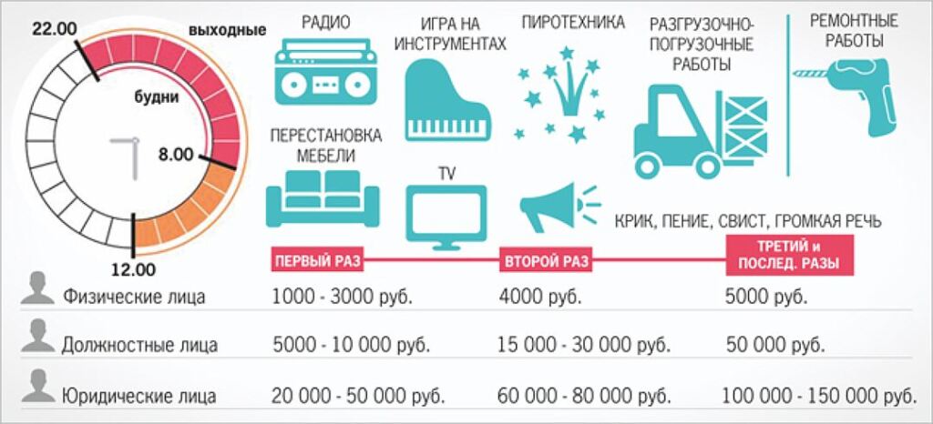 За превышение допустимого уровня шума в непредусмотренное для этого часы положено административное наказание в виде штрафа.